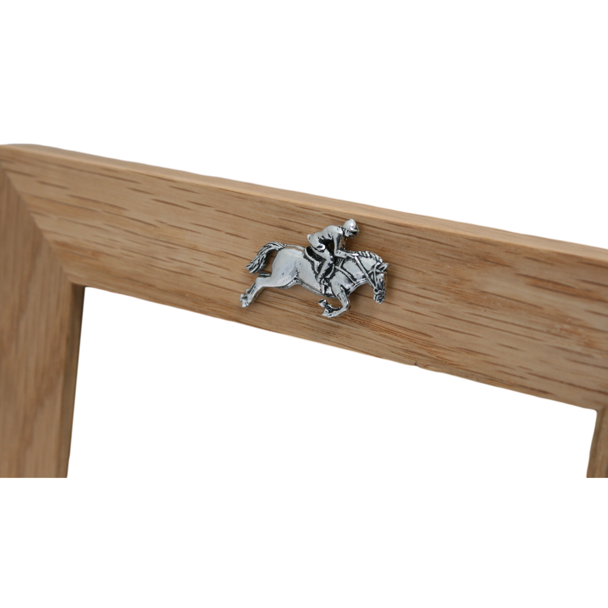 Adorning the top of the frame is a locally hand-cast pewter horse head in horse eventing motif, adding a unique and thoughtful touch.