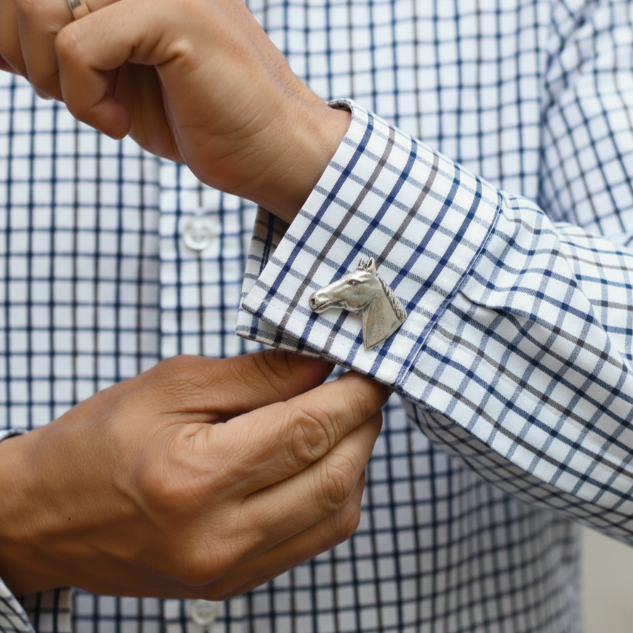 These horse head cufflinks are crafted in Worcestershire, U.K., using the highest-quality pewter. The reverse side of each cufflink is equipped with a traditional T-bar finding, ensuring a secure lock onto shirts.